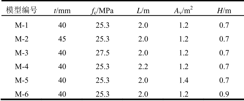模型编号 t/mm fc/MPa L/m Av/m2 H/m M-1 40 25.3 2.0 1.2 0.7 M-2 45 25.3 2.0 1.2 0.7 M-3 40 27.5 2.0 1.2 0.7 M-4 40 25.3 2.2 1.2 0.7 M-5 40 25.3 2.0 1.4 0.7 M-6 40 25.3 2.0 1.2 0.9