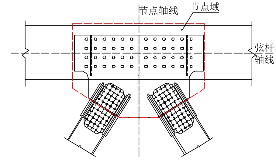 在对节点转动性能开展研究前,首先对节点域进行定义,以明确研究对象,方便后文叙述。本文所讲的节点域是指节点在受弯矩作用时,混凝土弦杆与钢腹杆连接处对抗弯承载力以及转动变形做出贡献的连接部件所围成的区域,如图3虚线内区域所示。