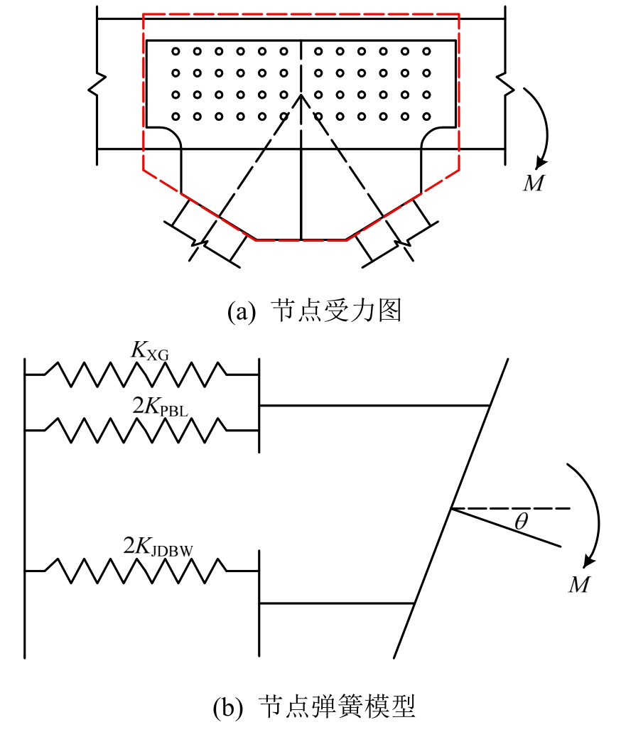 根据前文分析,可以将节点域简化为弹簧模型,如图5(b)所示。其中KXG为混凝土弦杆的抗剪刚度,KPBL为PBL剪力键群的抗剪刚度,KJDBW为外露节点板的抗剪刚度,视前后两侧PBL剪力键群、外露节点板的抗剪刚度一致。