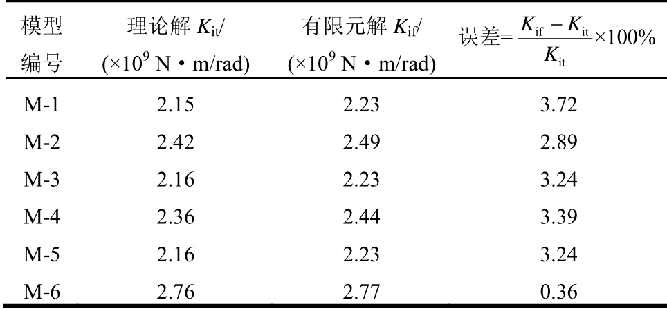 模型编号理论解Kit/ (×109 N·m/rad)有限元解Kif/ (×109 N·m/rad)误差=if it it×100%K K K-M-1 2.15 2.23 3.72 M-2 2.42 2.49 2.89 M-3 2.16 2.23 3.24 M-4 2.36 2.44 3.39 M-5 2.16 2.23 3.24 M-6 2.76 2.77 0.36