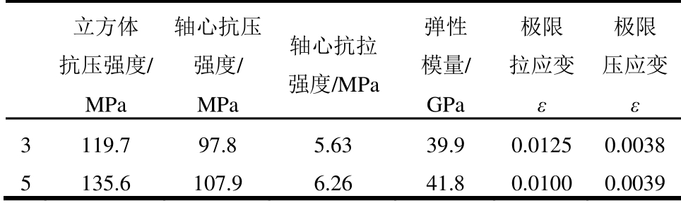 立方体 抗压强度/ MPa 轴心抗压强度/ MPa 轴心抗拉 强度/MPa 弹性 模量/ GPa 极限 拉应变ε 极限 压应变ε 3 119.7 97.8 5.63 39.9 0.0125 0.0038 5 135.6 107.9 6.26 41.8 0.0100 0.0039