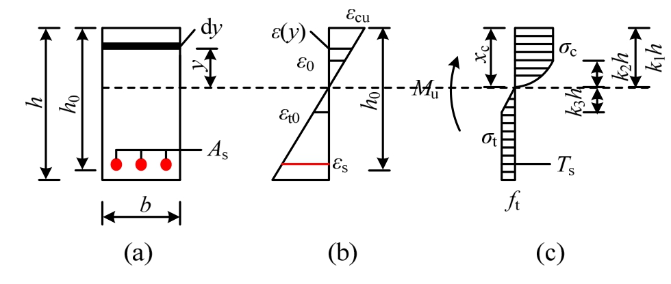 高强钢筋UHPC梁正截面承载力计算的基本假定与普通钢筋混凝土梁相似,主要区别在于UHPC开裂后,钢纤维在开裂面的桥接作用,可以承受一定的拉应力,所以UHPC梁截面受拉区可考虑纤维承受部分拉应力。