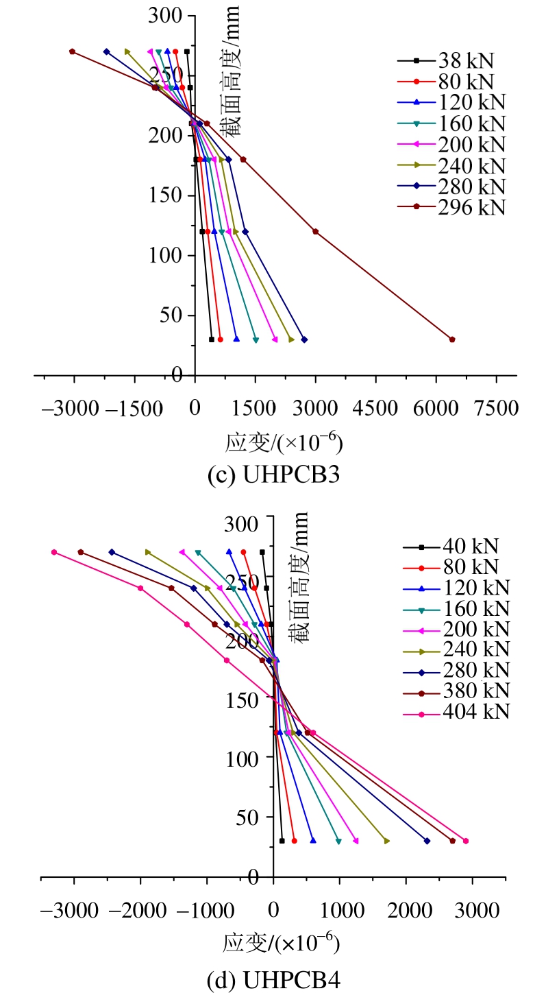 UHPC梁的正截面承载力计算是建立在平截面假定基础上的,故应对平截面假定进行验证。各梁跨中截面沿高度的平均应变分布如图8所示,可见基本呈线性变化,平截面假定成立。