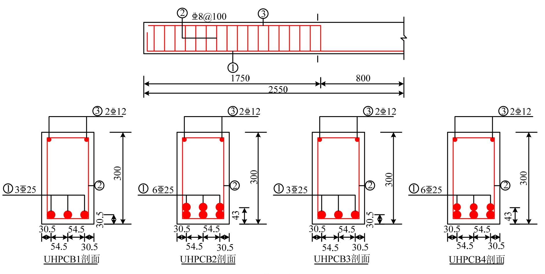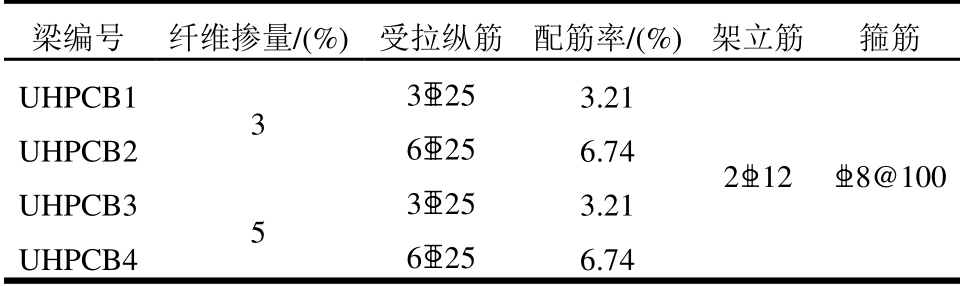 梁编号 纤维掺量/(%) 受拉纵筋 配筋率/(%)架立筋 箍筋 UHPCB1 3 3■25 3.21 2■12 ■8@100 UHPCB2 6■25 6.74 UHPCB3 5 3■25 3.21 UHPCB4 6■25 6.74