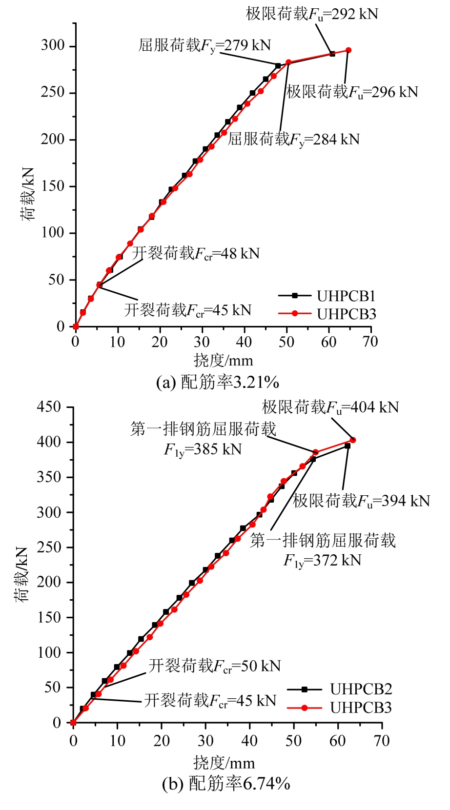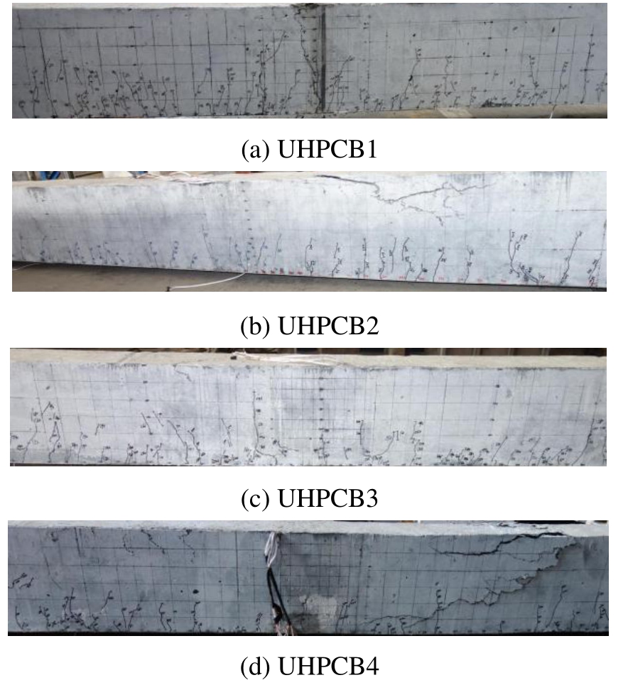 试件UHPCB1、UHPCB3纵向受拉钢筋先屈服,受拉区竖向裂缝向上延伸开展,中性轴位置逐渐上升,受压区高度降低,最终受压区UHPC被压酥起皮,梁宣告破坏,破坏形态为适筋破坏。