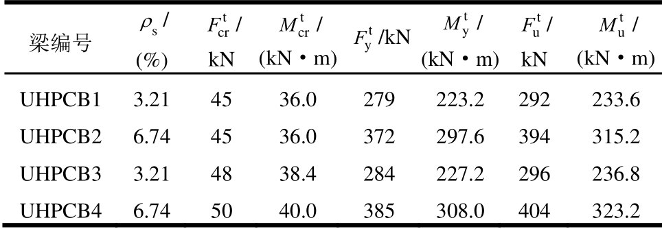 梁编号 sρ/ (%)t cr F / kN t cr M / (kN·m)tyF/kN t y M / (kN·m)tuF/ kN t u M / (kN·m)UHPCB1 3.21 45 36.0 279 223.2 292 233.6 UHPCB2 6.74 45 36.0 372 297.6 394 315.2 UHPCB3 3.21 48 38.4 284 227.2 296 236.8 UHPCB4 6.74 50 40.0 385 308.0 404 323.2