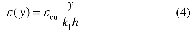 根据基本假定,可得在承载能力极限状态时截面的应力、应变分布(图10)。此时,截面受压区边缘UHPC达到了其极限压应变εcu。假定此时截面受压区高度为k1h,则距截面中性轴距离为y的UHPC纤维处的应变可按下式计算: