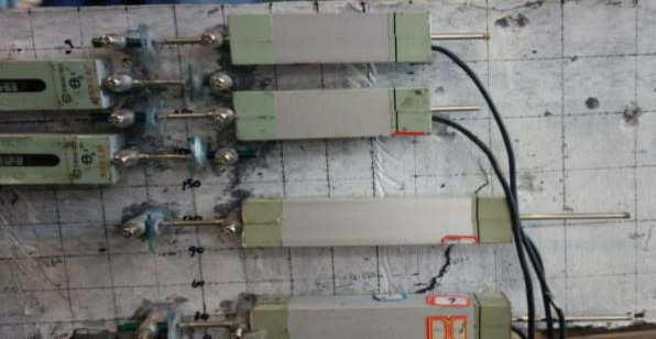 主要测试内容及方法有:1)在梁跨中及加载点位置布置位移计(图3),测试其挠度。2)沿梁截面高度布置位移计(图5),将位移计测得的两点距离变化量与两点原距离之比值作为两点所在高度处的平均应变;梁跨中底部粘贴混凝土应变片,测试其受拉应变。3)在梁底部跨中受拉钢筋上粘贴应变片,测试纵向受拉钢筋应变。4)为了能有效观察记录裂缝,试验梁两侧涂抹白灰并绘制网格,通过网格线观察裂缝发展形态及位置,通过裂缝对比卡,记录各级荷载下的裂缝宽度,在试验梁上绘出裂缝分布与开展情况。5)录试验梁的开裂荷载、极限荷载,观察试验现象和破坏形态。