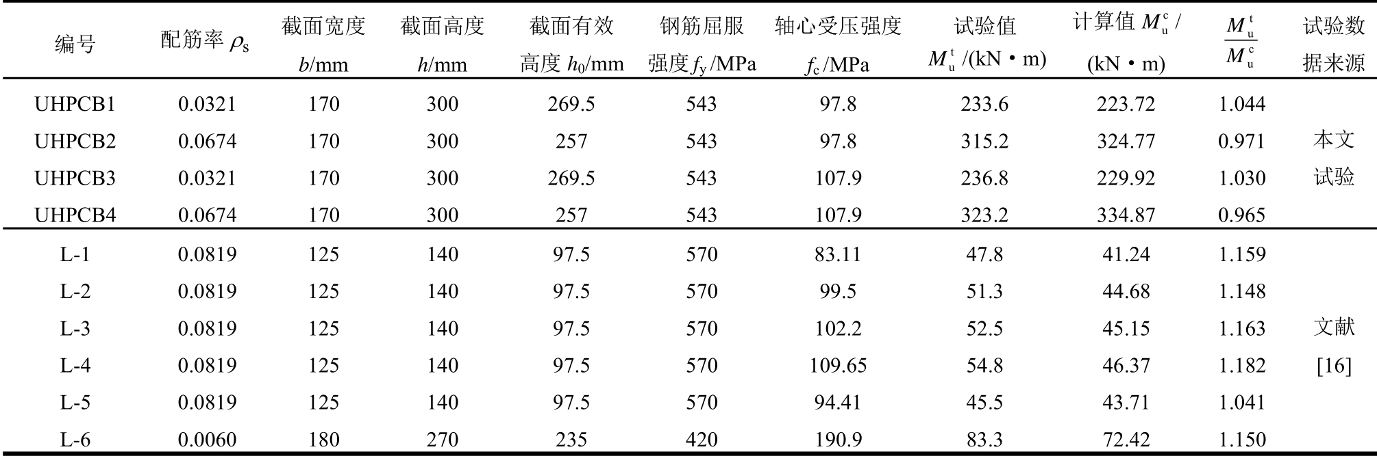 编号 配筋率sρ 截面宽度b/mm 截面高度 h/mm 截面有效 高度h0/mm钢筋屈服强度fy /MPa轴心受压强度fc /MPa 试验值 t u M/(kN·m)计算值 c u M / (kN·m)tucu M M 试验数据来源UHPCB1 0.0321 170 300 269.5 543 97.8 233.6 223.72 1.044 本文 试验 UHPCB2 0.0674 170 300 257 543 97.8 315.2 324.77 0.971 UHPCB3 0.0321 170 300 269.5 543 107.9 236.8 229.92 1.030 UHPCB4 0.0674 170 300 257 543 107.9 323.2 334.87 0.965 L-1 0.0819 125 140 97.5 570 83.11 47.8 41.24 1.159 文献[16]L-2 0.0819 125 140 97.5 570 99.5 51.3 44.68 1.148 L-3 0.0819 125 140 97.5 570 102.2 52.5 45.15 1.163 L-4 0.0819 125 140 97.5 570 109.65 54.8 46.37 1.182 L-5 0.0819 125 140 97.5 570 94.41 45.5 43.71 1.041 L-6 0.0060 180 270 235 420 190.9 83.3 72.42 1.150