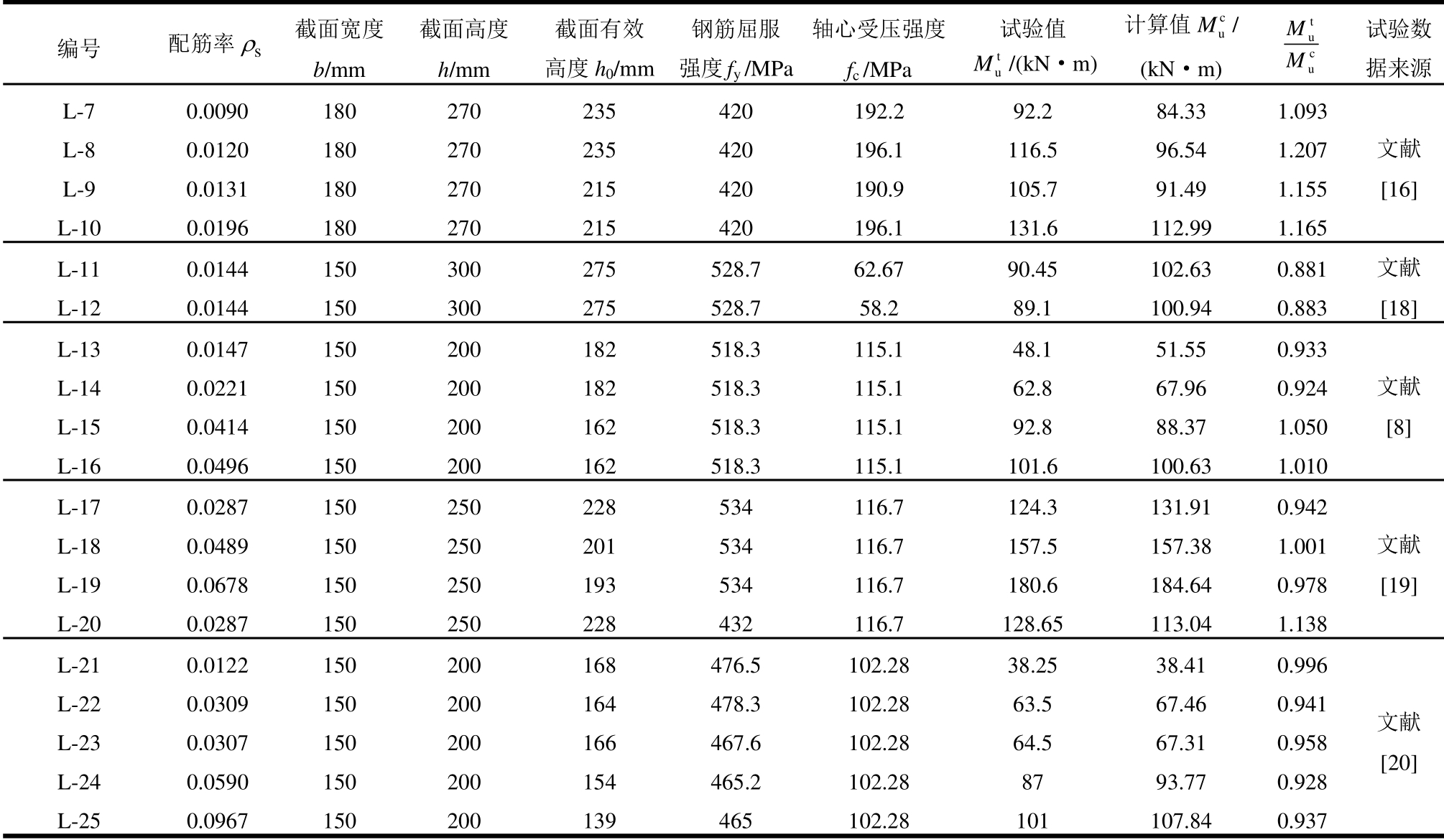 编号 配筋率 sρ 截面宽度b/mm 截面高度 h/mm 截面有效 高度h0/mm钢筋屈服强度fy /MPa轴心受压强度fc /MPa 试验值 t u M/(kN·m)计算值 c u M / (kN·m)tucu M M 试验数据来源L-7 0.0090 180 270 235 420 192.2 92.2 84.33 1.093 文献[16]L-8 0.0120 180 270 235 420 196.1 116.5 96.54 1.207 L-9 0.0131 180 270 215 420 190.9 105.7 91.49 1.155 L-10 0.0196 180 270 215 420 196.1 131.6 112.99 1.165 L-11 0.0144 150 300 275 528.7 62.67 90.45 102.63 0.881 文献[18]L-12 0.0144 150 300 275 528.7 58.2 89.1 100.94 0.883 L-13 0.0147 150 200 182 518.3 115.1 48.1 51.55 0.933 文献 [8]L-14 0.0221 150 200 182 518.3 115.1 62.8 67.96 0.924 L-15 0.0414 150 200 162 518.3 115.1 92.8 88.37 1.050 L-16 0.0496 150 200 162 518.3 115.1 101.6 100.63 1.010 L-17 0.0287 150 250 228 534 116.7 124.3 131.91 0.942 文献[19]L-18 0.0489 150 250 201 534 116.7 157.5 157.38 1.001 L-19 0.0678 150 250 193 534 116.7 180.6 184.64 0.978 L-20 0.0287 150 250 228 432 116.7 128.65 113.04 1.138 L-21 0.0122 150 200 168 476.5 102.28 38.25 38.41 0.996 文献[20]L-22 0.0309 150 200 164 478.3 102.28 63.5 67.46 0.941 L-23 0.0307 150 200 166 467.6 102.28 64.5 67.31 0.958 L-24 0.0590 150 200 154 465.2 102.28 87 93.77 0.928 L-25 0.0967 150 200 139 465 102.28 101 107.84 0.937