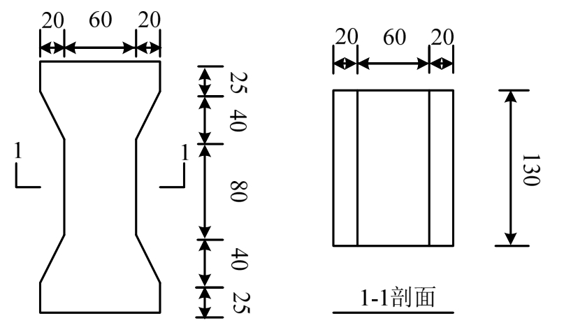 由于UHPC不含粗骨料,其成分类似于活性粉末混凝土(RPC),故根据RPC规程[12],其立方体试块尺寸选用100 mm×100 mm×100 mm;棱柱体试块尺寸为100 mm×100 mm×300 mm;轴心抗拉试件为狗骨形试件,尺寸如图1所示。试验测定的UHPC基本力学性能见表2。梁纵筋采用HRB500,箍筋和架立筋均采用HRB400,其实测力学性能指标见表3,其中弹性模量按规范[11]取值。