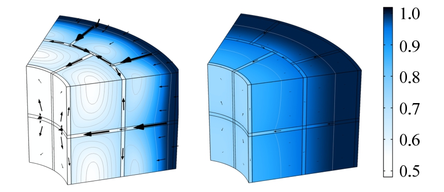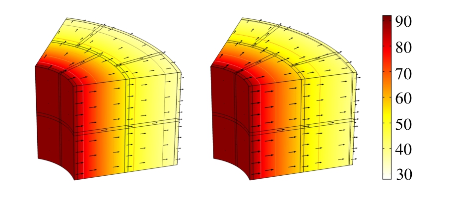 图10中箭头表示热通量的矢量,箭头长短与热通量大小的对数成正比,由图可知,虽然接缝的导热系数要略小于砌块,但是对整体的温度分布并未造成显著影响。由表3可知,随着饱和度的升高,砌块和接缝的热传导系数均有一定的提升,接缝的导热系数升高较为显著,在180 d时已经和砌块接近,整体能够达到国际原子能机构建议的大于1 W/m· ℃的要求。