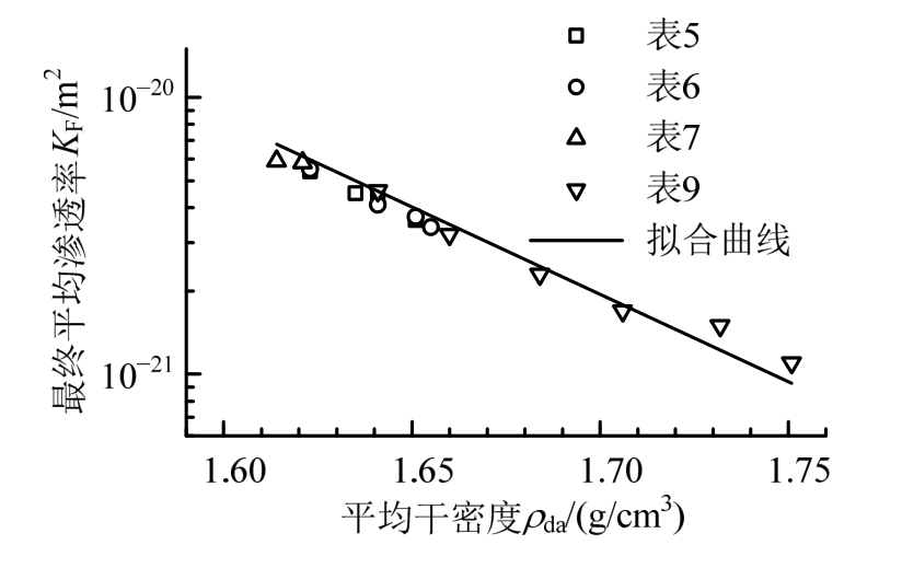 拟合曲线如图15所示,确定系数R2=0.9739。可知在多种接缝同时存在的情况下,最终平均渗透 率和平均干密度近似成指数关系,平均干密度越高平均渗透率越低,与已有试验结果的规律相似[3]。
