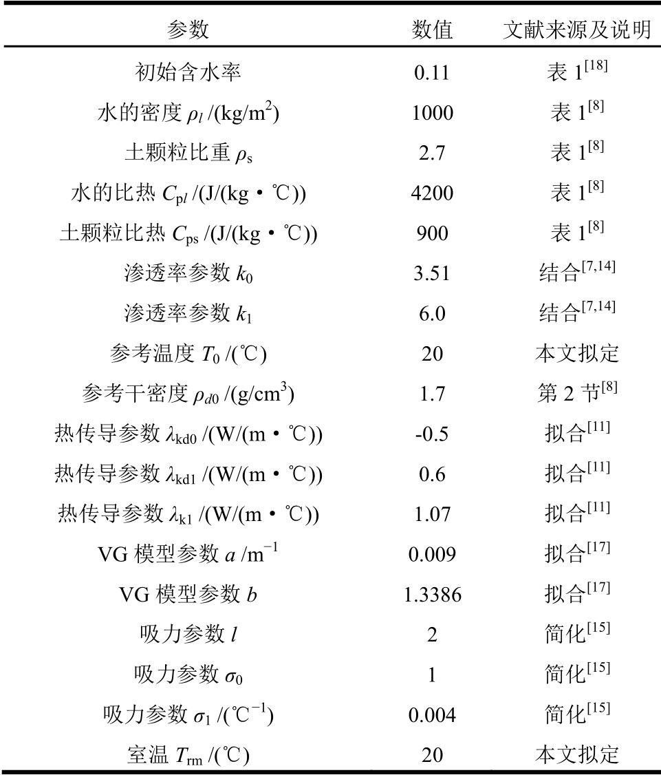 参数 数值 文献来源及说明初始含水率 0.11 表1[18] 水的密度ρl /(kg/m2) 1000 表1[8] 土颗粒比重ρs2.7 表1[8] 水的比热Cpl /(J/(kg·℃)) 4200 表1[8] 土颗粒比热Cps /(J/(kg· ))℃ 900 表1[8] 渗透率参数k03.51 结合[7,14] 渗透率参数k16.0 结合[7,14] 参考温度T0 /( )℃ 20 本文拟定 参考干密度ρd0 /(g/cm3) 1.7 第2节[8] 热传导参数λkd0 /(W/(m· ))℃ -0.5 拟合[11] 热传导参数λkd1 /(W/(m· ))℃ 0.6 拟合[11] 热传导参数λk1 /(W/(m· ))℃ 1.07 拟合[11] VG模型参数a /m-1 0.009 拟合[17] VG模型参数b 1.3386 拟合[17] 吸力参数l 2 简化[15] 吸力参数σ01 简化[15] 吸力参数σ1 /(℃-1) 0.004 简化[15] 室温Trm /( )℃ 20 本文拟定