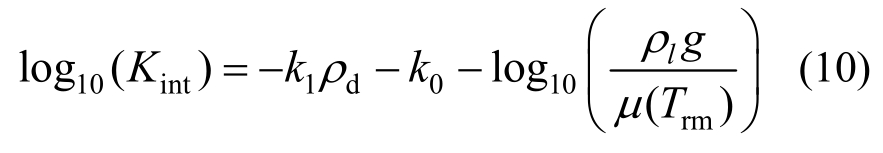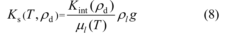 式中:温度T的单位为℃,下同。结合式(7)~式(9)可得Kint与干密度的关系: