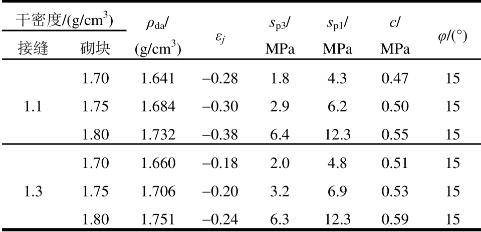 干密度/(g/cm3) ρda/ (g/cm3) εjsp3/ MPa sp1/ MPa c/ MPa φ/(°)接缝 砌块 1.1 1.70 1.641 -0.28 1.8 4.3 0.47 15 1.75 1.684 -0.30 2.9 6.2 0.50 15 1.80 1.732 -0.38 6.4 12.3 0.55 15 1.3 1.70 1.660 -0.18 2.0 4.8 0.51 15 1.75 1.706 -0.20 3.2 6.9 0.53 15 1.80 1.751 -0.24 6.3 12.3 0.59 15