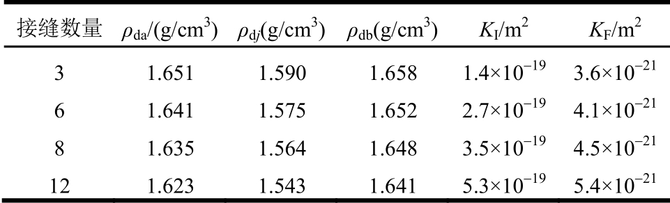 接缝数量 ρda/(g/cm3)ρdj(g/cm3)ρdb(g/cm3) KI/m2 KF/m2 3 1.651 1.590 1.658 1.4×10-19 3.6×10-21 6 1.641 1.575 1.652 2.7×10-19 4.1×10-21 8 1.635 1.564 1.648 3.5×10-19 4.5×10-21 12 1.623 1.543 1.641 5.3×10-19 5.4×10-21