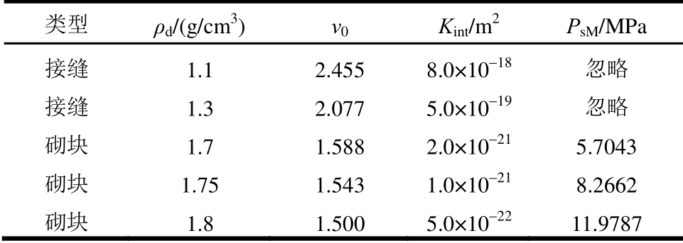 类型 ρd/(g/cm3) v0Kint/m2 PsM/MPa 接缝 1.1 2.455 8.0×10-18 忽略 接缝 1.3 2.077 5.0×10-19 忽略 砌块 1.7 1.588 2.0×10-21 5.7043 砌块 1.75 1.543 1.0×10-21 8.2662 砌块 1.8 1.500 5.0×10-22 11.9787