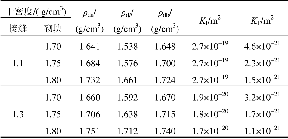 干密度/( g/cm3) ρda/ (g/cm3)ρdj/ (g/cm3)ρdb/ (g/cm3) KI/m2 KF/m2 接缝 砌块 1.1 1.70 1.641 1.538 1.648 2.7×10-19 4.6×10-21 1.75 1.684 1.576 1.700 2.7×10-19 2.3×10-21 1.80 1.732 1.661 1.724 2.7×10-19 1.5×10-21 1.3 1.70 1.660 1.592 1.670 1.9×10-20 3.2×10-21 1.75 1.706 1.638 1.715 1.8×10-20 1.7×10-21 1.80 1.751 1.712 1.740 1.7×10-20 1.1×10-21