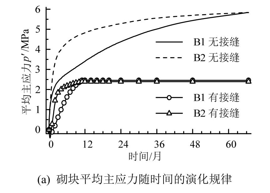 缓冲材料内的应力由膨润土吸水膨胀产生。有接缝材料在12 月时完全饱和,应力停止增长,最终材料内的膨胀力约为2.5 MPa,而无接缝材料的膨胀力会一直增长到砌块的最大膨胀力PsM=5.8 MPa。接缝的存在会使整体的膨胀力有一定的减小,但仍能满足膨胀力>2 MPa的一般设计要求[26]。而且结合图5可以发现,尽管有接缝的材料饱和较快,但由于接缝的存在,膨润土的应力增长延迟出现。