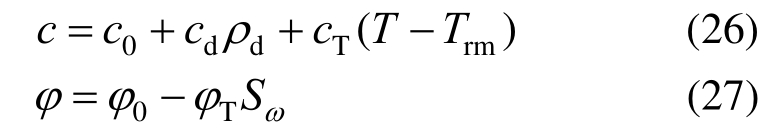 接缝由于强度较低,可能出现屈服,计算中使用Mohr-Coulomb屈服准则,通过大小主应力和粘聚力c内摩擦角φ判断是否屈服。砌块则使用弹性模型。陈皓[25]研究表明,膨润土的粘聚力c会随着干密度和温度升高而升高,内摩擦角φ则主要与饱和度有关,近似有: