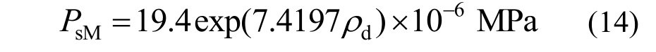 膨润土在体积不变的情况下,完全饱和后产生的膨胀力为最大膨胀力PsM,PsM与膨润土的干密度、初始含水率、蒙脱石含量、试验方法等有关。缓冲材料处在密闭的空间中,接近于恒体积法的试验条件,根据叶为民等[18]恒体积试验结果,得到初始含水量11%,初始温度为20℃的GMZ01膨润土膨胀力与干密度的关系式为: