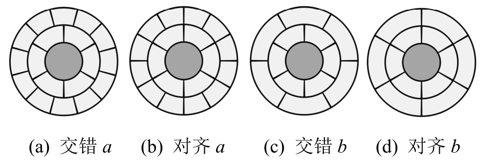 内层和外层径向接缝的平均宽度均为10 mm,交错a和对齐a的布置参考FEBEX项目[28]的方案,交错b和对齐b为笔者设计,示意图见图14。因为横向接缝的影响与径向接缝类似,本节计算不考虑横向接缝,计算结果见表7。