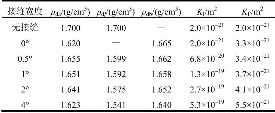 接缝宽度 ρda/(g/cm3)ρdj/(g/cm3)ρdb/(g/cm3) KI/m2 KF/m2无接缝 1.700 1.700 — 2.0×10-21 2.0×10-21 0° 1.620 — 1.665 2.0×10-21 3.3×10-21 0.5° 1.655 1.599 1.662 6.8×10-20 3.4×10-21 1° 1.651 1.592 1.658 1.3×10-19 3.7×10-21 2° 1.641 1.575 1.652 2.7×10-19 4.1×10-21 4° 1.623 1.541 1.640 5.3×10-19 5.5×10-21