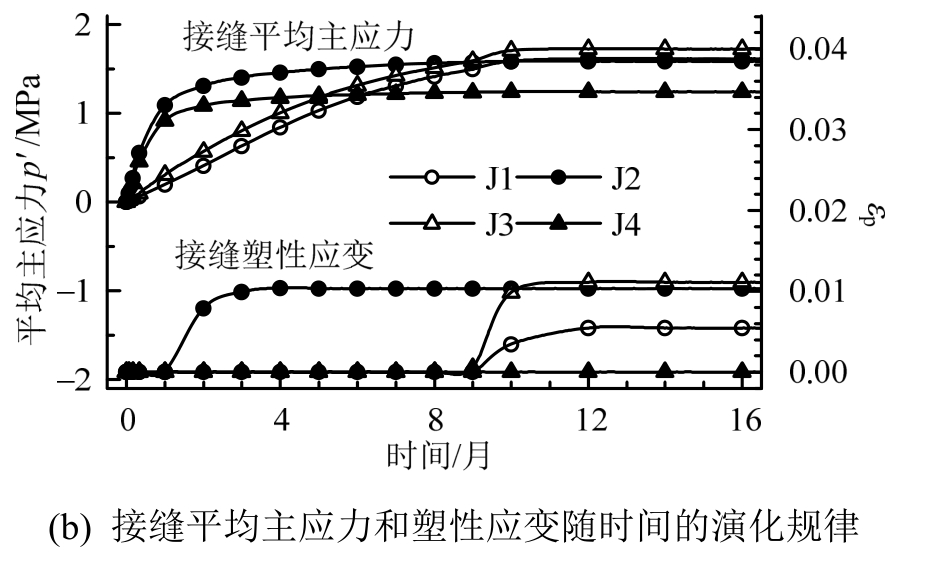 图4中B1、B2、B3、B4为砌块内的点,J1、J2为横向接缝内的点,J3、J4为径向接缝内的点,用于记录计算过程中的相关数据。模型使用Comsol自带的几何模块进行绘制,网格3456个域单元、3480个边界元和1208个边单元。各个域之间选择“形成联合体”,保证接触面两侧的位移是连续的,各物理场可以通过接触面传递。砌块的应力-应变采用非线性弹性模型计算,注意需要将体积模量转化为变形模量,泊松比为定值,膨胀力以添加“外部应力”的方式加以实现,接缝使用弹塑性模型,选择“Mohr-Coulomb”屈服准则,塑性势选择关联流动。各物理场均采用二次离散,使用“MUMPS”求解器进行瞬态求解,时间步进采用向后差分公式,初始步长10 d~8 d。