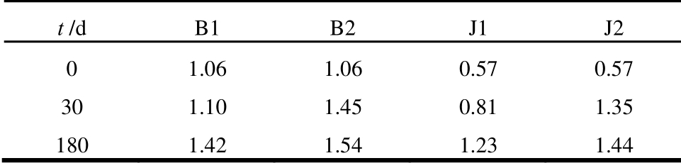 t /d B1 B2 J1 J2 0 1.06 1.06 0.57 0.57 30 1.10 1.45 0.81 1.35 180 1.42 1.54 1.23 1.44