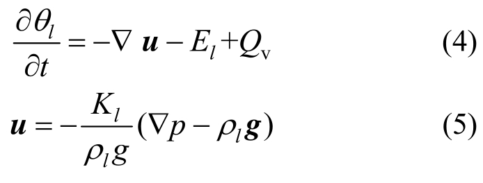 式中:θl为水的体积分数;g为重力加速度的矢量;El为蒸发项;Qv为源项。p/MPa为水压力;Kl/(m/s)为渗透系数: