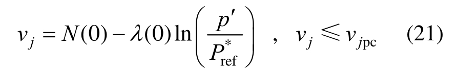为参考应力;N(0)为参考比体积,通过压缩试验[22]得到;vjpc为先期固结压力对应的比体积,假定v>vjpc时土体为线弹性,弹性模量等于v=vjpc时的弹性模量。因此可得:
