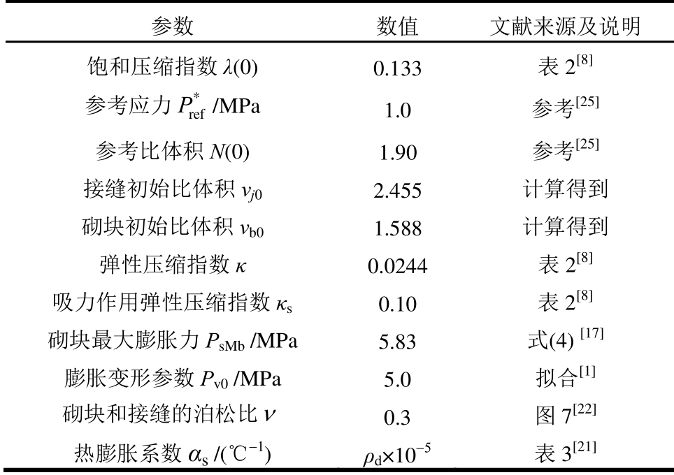 参数 数值 文献来源及说明 饱和压缩指数λ(0) 0.133 表2[8] 参考应力 *ref P /MPa 1.0 参考[25] 参考比体积N(0) 1.90 参考[25] 接缝初始比体积vj02.455 计算得到 砌块初始比体积vb01.588 计算得到 弹性压缩指数κ 0.0244 表2[8] 吸力作用弹性压缩指数κs0.10 表2[8] 砌块最大膨胀力PsMb /MPa 5.83 式(4)[17] 膨胀变形参数Pv0 /MPa 5.0 拟合[1] 砌块和接缝的泊松比ν 0.3 图7[22] 热膨胀系数αs /(℃-1) ρd×10-5 表3[21]