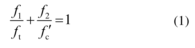 式中:f1和f2分别为混凝土压杆底部节点区所受到的主拉应力和主压应力;f′c为混凝土圆柱体抗压强度;ft为综合考虑混凝土、腹筋和底部纵筋贡献的复合抗拉强度。