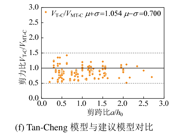 (1)在保证精度基础上,提出修正后的Tan-Cheng模型。建议计算结果与试验结果吻合良好,与中国GB50010—2010、美国ACI 318-14、加拿大CSA A23.3-04和欧洲EC2等规范计算结果相当,且离散程度较小,能够准确、合理地预测深受弯构件受剪承载力;