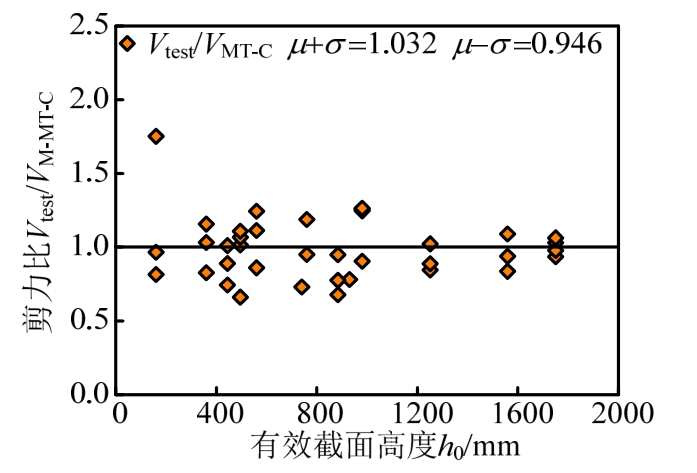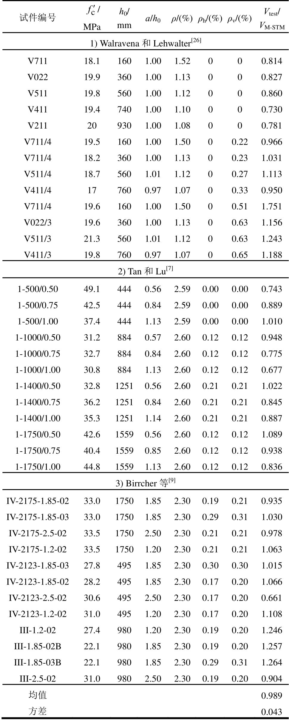 试件编号 cf′/ MPa h0/ mm a/h0ρ/(%)ρh/(%)ρv/(%) Vtest/ VM-STM 1)Walravena和Lehwalter[26] V711 18.1 160 1.00 1.52 0 0 0.814 V022 19.9 360 1.00 1.13 0 0 0.827 V511 19.8 560 1.00 1.12 0 0 0.860 V411 19.4 740 1.00 1.10 0 0 0.730 V211 20 930 1.00 1.08 0 0 0.781 V711/4 19.5 160 1.00 1.50 0 0.22 0.966 V711/4 18.2 360 1.00 1.13 0 0.23 1.031 V511/4 18.7 560 1.01 1.12 0 0.27 1.113 V411/4 17 760 0.97 1.07 0 0.33 0.950 V711/4 19.6 160 1.00 1.50 0 0.51 1.751 V022/3 19.6 360 1.00 1.13 0 0.63 1.156 V511/3 21.3 560 1.01 1.12 0 0.63 1.243 V411/3 19.8 760 0.97 1.07 0 0.65 1.188 2)Tan和Lu[7] 1-500/0.50 49.1 444 0.56 2.59 0.00 0.00 0.743 1-500/0.75 42.5 444 0.84 2.59 0.00 0.00 0.889 1-500/1.00 37.4 444 1.13 2.59 0.00 0.00 1.010 1-1000/0.50 31.2 884 0.57 2.60 0.12 0.12 0.948 1-1000/0.75 32.7 884 0.84 2.60 0.12 0.12 0.775 1-1000/1.00 30.8 884 1.13 2.60 0.12 0.12 0.677 1-1400/0.50 32.8 1251 0.56 2.60 0.21 0.21 1.022 1-1400/0.75 36.2 1251 0.84 2.60 0.21 0.21 0.845 1-1400/1.00 35.3 1251 1.14 2.60 0.21 0.21 0.887 1-1750/0.50 42.6 1559 0.56 2.60 0.12 0.12 1.089 1-1750/0.75 40.4 1559 0.85 2.60 0.12 0.12 0.938 1-1750/1.00 44.8 1559 1.13 2.60 0.12 0.12 0.836 3)Birrcher等[9] IV-2175-1.85-02 33.0 1750 1.85 2.30 0.19 0.21 0.935 IV-2175-1.85-03 33.0 1750 1.85 2.30 0.29 0.31 1.030 IV-2175-2.5-02 33.5 1750 2.50 2.30 0.21 0.21 0.978 IV-2175-1.2-02 33.5 1750 1.20 2.30 0.21 0.21 1.063 IV-2123-1.85-03 27.8 495 1.85 2.30 0.30 0.30 1.015 IV-2123-1.85-02 28.2 495 1.85 2.30 0.17 0.20 1.066 IV-2123-2.5-02 30.6 495 2.50 2.30 0.17 0.20 0.661 IV-2123-1.2-02 31.0 495 1.20 2.30 0.17 0.20 1.108 III-1.2-02 27.4 980 1.20 2.30 0.19 0.20 1.246 III-1.85-02B 22.1 980 1.85 2.30 0.19 0.20 1.257 III-1.85-03B 22.1 980 1.85 2.30 0.29 0.31 1.264 III-2.5-02 31.0 980 2.50 2.30 0.19 0.20 0.904均值 0.989方差 0.043