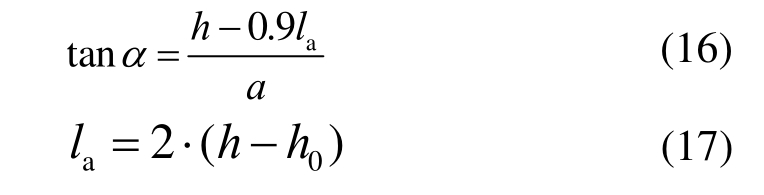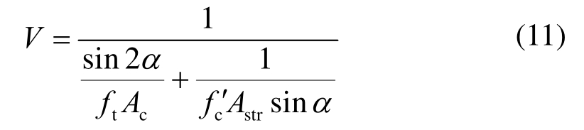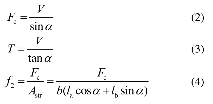式中:Astr为混凝土斜压杆截面面积;la为压杆底部节点区高度;lb为支座处垫板宽度;α为斜压杆与底部纵筋的夹角,按下式计算: