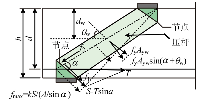 式中:As为底部纵筋截面面积;Ac为深受弯构件截面面积;Aw为腹筋面积;fy和fyw分别为纵筋和腹筋的屈服强度;h0为构件有效截面高度;dw为梁顶至腹筋与斜压杆中心线交点的垂直距离;θw为腹筋与水平轴间的夹角(见图2)。