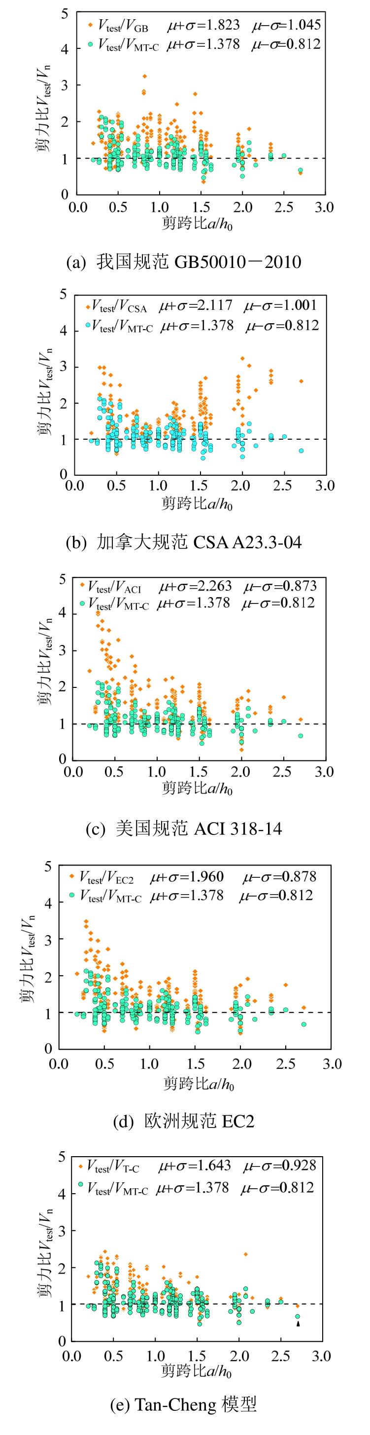 收集了国内外308组深受弯构件受剪试验数据,选取依据:1)简支试件的加载板与支撑板尺寸已知;2)试件剪跨比小于2且跨高比小于5;3)试件均发生剪切破坏。分别采用我国《混凝土结构设计规范》(GB50010—2010)[14]、加拿大CSA A23.3-04规范、美国ACI 318-14规范、欧洲EC2规范、Tan-Cheng模型等相关计算模型和本文建议模型对308组深受弯构件的受剪承载力进行计算,并与试验结果对比,具体结果见表1和图5。由表1可知:1)各国规范对深受弯构件受剪承载力的计算结果偏于安全。美国ACI 318-14、加拿大CSA A23.3-04、欧洲EC2等规范均基于拉压杆模型建立,仅混凝土压杆有效抗压强度和压杆倾角α的计算存在差异,属下限设计方法。而我国规范基于半理论半经验模型建立,因此,计算结果较其余三国规范更接近试验结果,吻合较好;2)试验值与本文建议模型计算值比值的均值为1.095,方差为0.08,模型预测结果与试验结果吻合良好,且离散程度较小,较各国规范计算结果更接近试验值;3)由图5(f)可见,修正后Tan-Cheng模型与Tan-Cheng模型计算精度相近,表明在Tan-Cheng模型基础上本文修正方法是合理的。