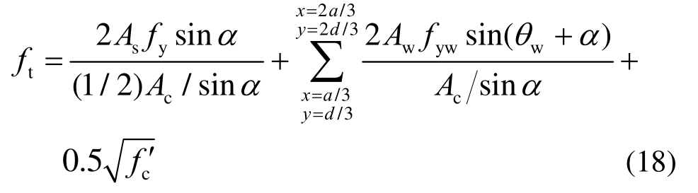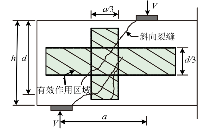 复合抗拉强度ft的计算综合考虑了混凝土、纵筋和腹筋的贡献。对于底部纵筋而言,混凝土开裂退出工作使得纵筋应力突然增大,故本文根据纵筋沿垂直于压杆方向的拉应力分布情况,假定其在试件1/2高度以下部分发挥主要作用,而忽略纵筋在试件1/2高度以上部分的作用;对于腹筋而言,因需明确其在剪跨内的具体分布位置,计算过程较为复杂。然而,Matamoros和Wong[13]指出,深受弯构件斜向开裂后,支座处和加载点附近腹筋应变较小,而穿过斜裂缝中部的腹筋应变较大,因此,为考虑腹筋对抗剪的影响,提出腹筋有效作用区域的概念(见图4),同时忽略此区域外腹筋的作用。基于上述两点假设,且不考虑腹筋沿试件有效截面高度的分布水平dw/h0,可建议采用下式对ft进行计算: