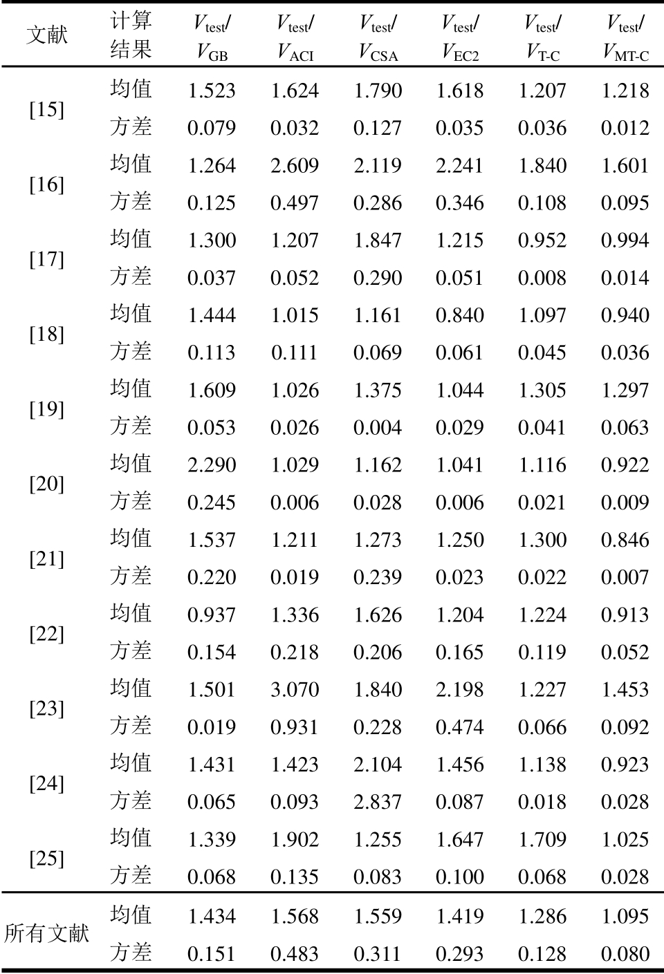 文献 计算结果Vtest/ VGB Vtest/ VACI Vtest/ VCSA Vtest/ VEC2 Vtest/ VT-C Vtest/VMT-C[15]均值 1.523 1.624 1.790 1.618 1.207 1.218方差 0.079 0.032 0.127 0.035 0.036 0.012[16]均值 1.264 2.609 2.119 2.241 1.840 1.601方差 0.125 0.497 0.286 0.346 0.108 0.095[17]均值 1.300 1.207 1.847 1.215 0.952 0.994方差 0.037 0.052 0.290 0.051 0.008 0.014[18]均值 1.444 1.015 1.161 0.840 1.097 0.940方差 0.113 0.111 0.069 0.061 0.045 0.036[19]均值 1.609 1.026 1.375 1.044 1.305 1.297方差 0.053 0.026 0.004 0.029 0.041 0.063[20]均值 2.290 1.029 1.162 1.041 1.116 0.922方差 0.245 0.006 0.028 0.006 0.021 0.009[21]均值 1.537 1.211 1.273 1.250 1.300 0.846方差 0.220 0.019 0.239 0.023 0.022 0.007[22]均值 0.937 1.336 1.626 1.204 1.224 0.913方差 0.154 0.218 0.206 0.165 0.119 0.052[23]均值 1.501 3.070 1.840 2.198 1.227 1.453方差 0.019 0.931 0.228 0.474 0.066 0.092[24]均值 1.431 1.423 2.104 1.456 1.138 0.923方差 0.065 0.093 2.837 0.087 0.018 0.028[25]均值 1.339 1.902 1.255 1.647 1.709 1.025方差 0.068 0.135 0.083 0.100 0.068 0.028所有文献 均值 1.434 1.568 1.559 1.419 1.286 1.095方差 0.151 0.483 0.311 0.293 0.128 0.080