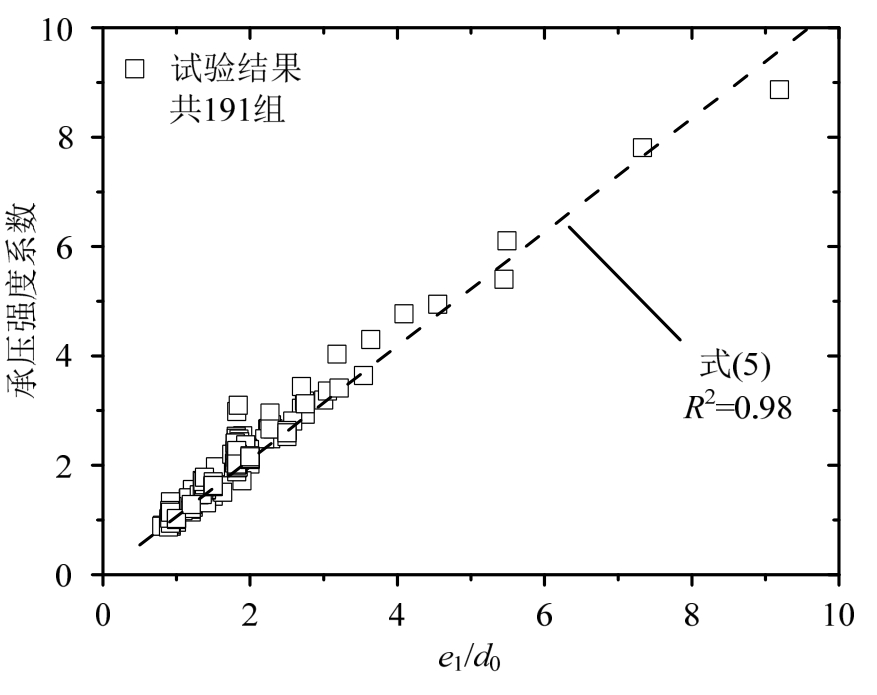 图8中的实测承压强度系数与参数e1/d0之间呈线性关系,基于本研究的试验数据以最小二乘法进行线性拟合,得到了承压承载力与端距e1/d0的关系,式(5)。为进一步验证式(5)的适用性,搜集了欧洲规范研究报告[20—22]和文献[7—8]中共191组试验结果与式(5)预测值进行对比,见图9。该191组试验结果采用的钢材的实测屈服强度范围为251 MPa~761 MPa。图9的结果表明,式(5)的预测精度较高,可用来预测不同强度等级的钢材和不同e1/d0对应的承压强度系数。