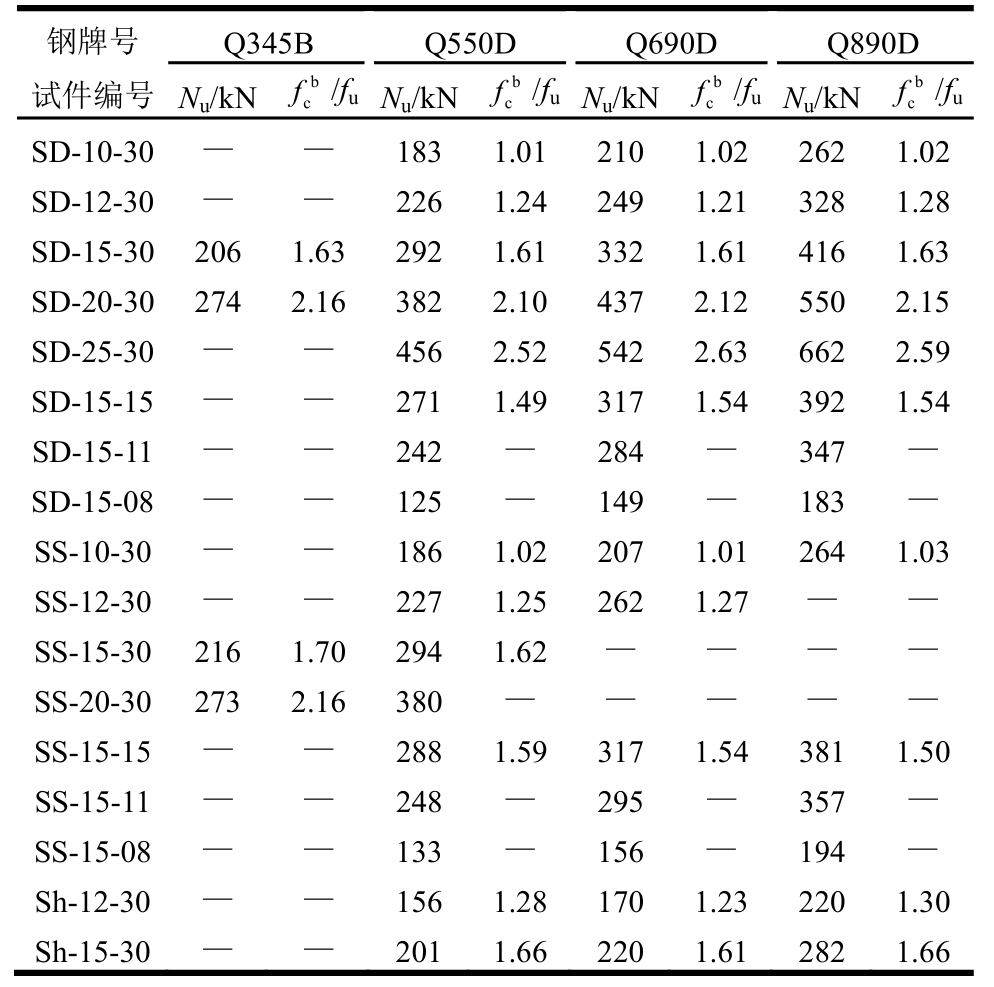 本试验50组试件的极限承载力Nu汇总于表4。为便于比较结果,设置表4中每一行为相同几何尺寸试件,每一列为相同的钢材等级试件。根据式(1)可由受剪破坏试件的极限承载力算得其承压强度值,即