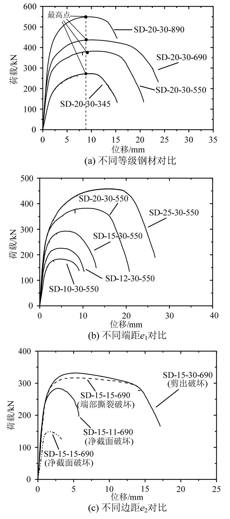 3)图7(c)对比了Q690试件不同边距e2下的荷载-位移曲线,结果表明,在边距足够避免净截面破坏时,剪出破坏和端部撕裂破坏的荷载-位移曲线差异较小;但当边距e2进一步降低,发生净截面破坏时,连接试件的承载力与变形能力均大幅降低;