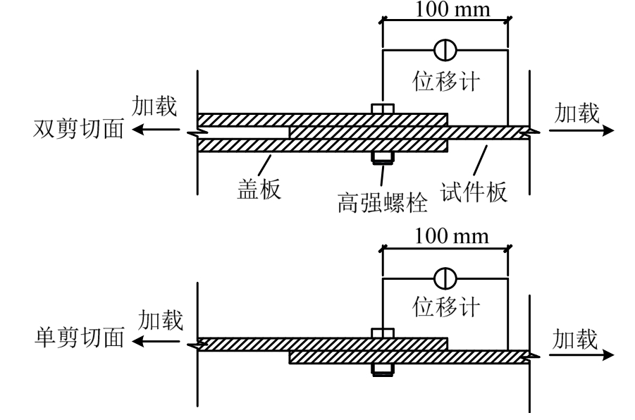 本文的试验设置如图4所示,一个试件组由试件板、盖板和高强螺栓组成。试验采用12.9级的高强螺栓,包括M24和M16两种螺栓,相应的螺栓孔直径分别为26 mm和18 mm,螺栓不施加预紧力,实测螺栓材料的抗拉强度为1437 MPa。全部试件在同济大学结构工程试验室的万能材料试验机进行加载。试验时,先进行预加载,以闭合螺栓与孔壁之间的间隙,预加载结束后卸载至零,以1.5 mm/min的加载速率进行单调加载,直至试件破坏。试件采用量程为30 mm的位移计来测量试件和盖板间的相对变形,位移计的初始标距为100 mm,如图4所示。
