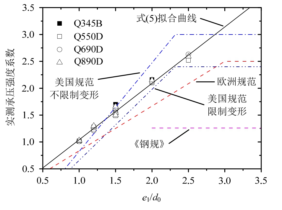 (4)欧洲规范对于承压承载力的预测相比本文试验结果总体偏保守。现行美国规范考虑限制螺栓孔变形的预测公式总体偏保守,但不考虑限制螺栓孔变形的公式在e1>1.5d0时可能不安全;