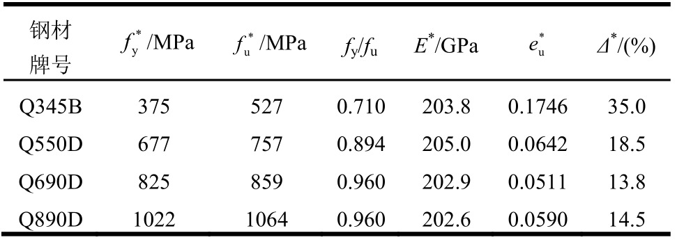 钢材 牌号 *y f/MPa *u f/MPa fy/fuE*/GPa *u e Δ*/(%)Q345B 375 527 0.710 203.8 0.1746 35.0 Q550D 677 757 0.894 205.0 0.0642 18.5 Q690D 825 859 0.960 202.9 0.0511 13.8 Q890D 1022 1064 0.960 202.6 0.0590 14.5