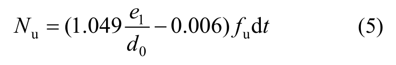 ANSI/AISC 360-10将承压型连接的设计按两种情况分别考虑,当设计需要考虑限制螺栓孔的变形时,承压承载力按照式(3)计算;当设计不需要考虑限制螺栓孔的变形时,承压承载力按照式(4)计算。ANSI/AISC 360-10的公式建立在净距lc的概念上,净距lc和EN 1993-1-8中的端距e1相差0.5倍的螺栓孔径d0。对于式(3)还是式(4),换算得到的最大