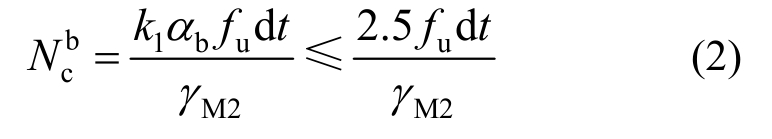 式中:αb取值为min(αb, fub/fu, 1.0);fub是螺栓材料的极限抗拉强度,对于端部位置的螺栓,αd=e1/3d0;k1取值为min(2.8e2/d0-1.7, 2.5);e1和e2是欧洲规范中定义的几何参数;d和d0分别为螺栓直径和螺栓孔径;t是钢板厚度;γM2是分项系数,在本文计算时取为1.0。