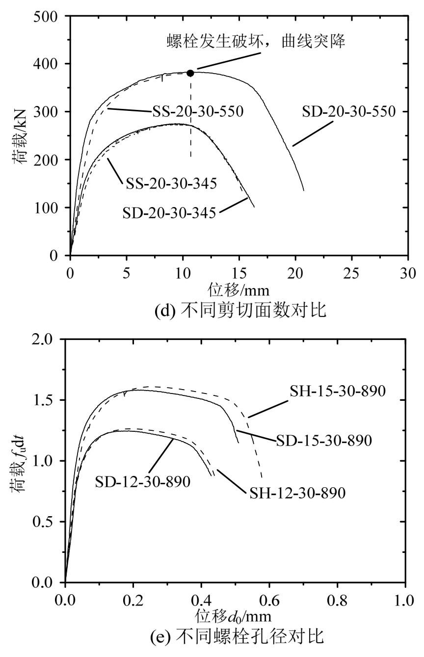 4)图7(d)对比了试件在单、双剪切面条件下的荷载-位移曲线,当不发生螺栓受剪破坏时,单剪切面和双剪切面的荷载位移曲线差异较小。但对于承压承载力较高的高强钢连接试件,当采用单剪切面时试件易发生螺栓受剪破坏,导致连接破坏呈脆性,应在设计中尽量避免;